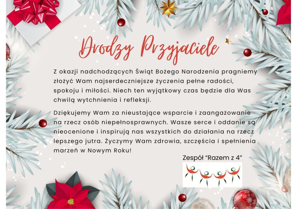 Kochani!Nadchodzi czas, w którym możemy nieco zwolnić tempa, odsunąć sprawy bieżące na bok. To moment zatrzymania, odpoczynku i bliskości.Niech każdy z nas spędzi Święta w atmosferze radości, pokoju i miłości! Dziękujemy, że wciąż możemy na Was liczyć, że wspólnie czynimy dobro! Wspaniałego czasu!
